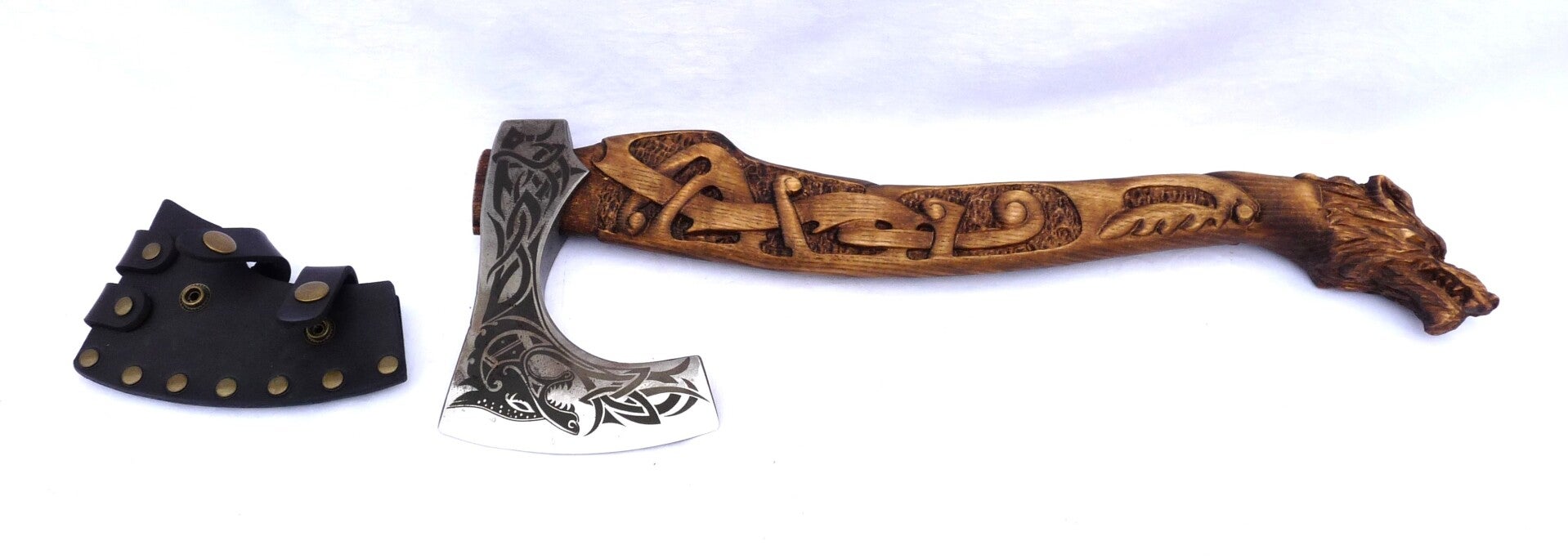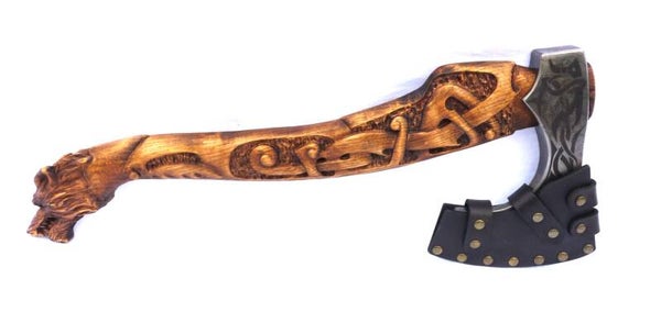Handgeschmiedete Wikingeraxt, mit geschnitztem Griff „Werwolf“