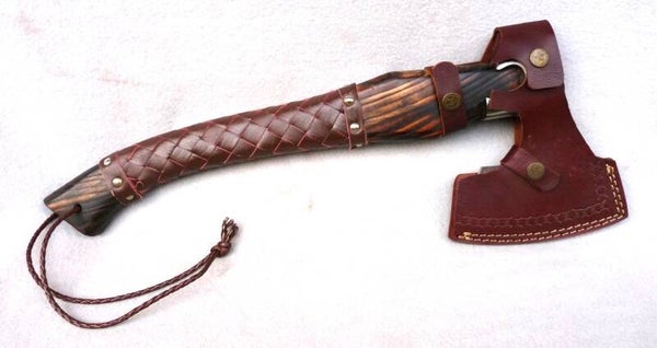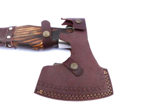 Ein Axt Holster aus Leder mit Gürtelschlaufe für den Axt Kopf.